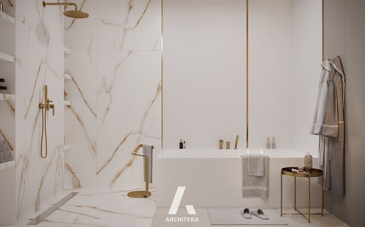 Wnętrze otulone jest bielą pomieszaną ze złotymi refleksami dzięki płytkom imitującym biały marmur Gres Carrara Gold. Delikatne żyłowanie sprawia, że ściany nie są nachalnie stylistycznie. Płytki mają rektyfikowane brzegi i są polerowane, co stanowi o wyjątkowej elegancji, nawiązującej do stylu glamour. Klimat uzupełnia śnieżnobiały gres szkliwiony o satynowo-matowej powierzchni. W niektórych miejscach na ścianach zastosowano gres super white o wysokim połysku. Płytki mają ciemniejszy odcień, dlatego tworzy się zjawiskowa mozaika.