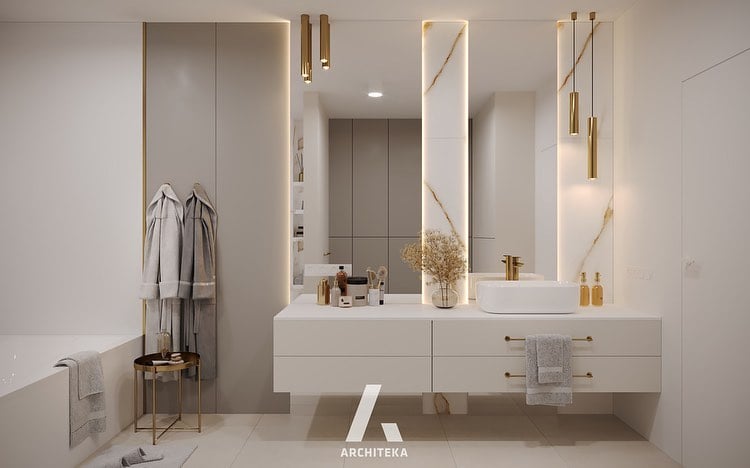 Biel stosowana w aranżacjach łazienek to popularne i ponadczasowe rozwiązanie. Dopasuje się prawie do każdego stylu i dodaje mu świeżości. Jasna kolorystyka kojarzy się z elegancją i minimalizmem. Umiejętnie połączona z innymi kolorami tworzy ciekawe zestawienia i tonuje estetyczny wymiar wnętrza. Doskonale widać to w biało-złotej realizacji nowoczesnej łazienki. Spoglądając na nią odnosi się wrażenie harmonii i subtelnej wytworności zatopionej w śnieżnobiałym tle. Nieduże, ale wyraźne złote krople dopełniają eleganckiego sznytu łazienki i tworzą biżuteryjny dekor.