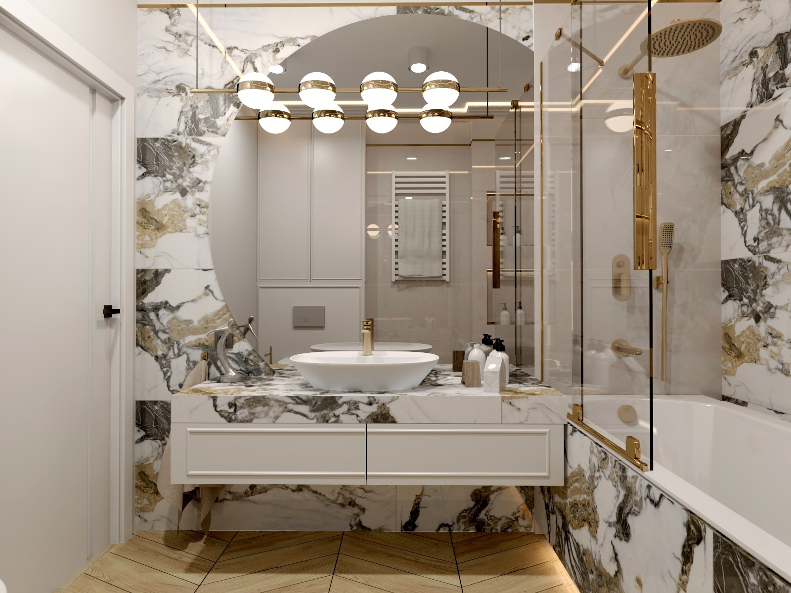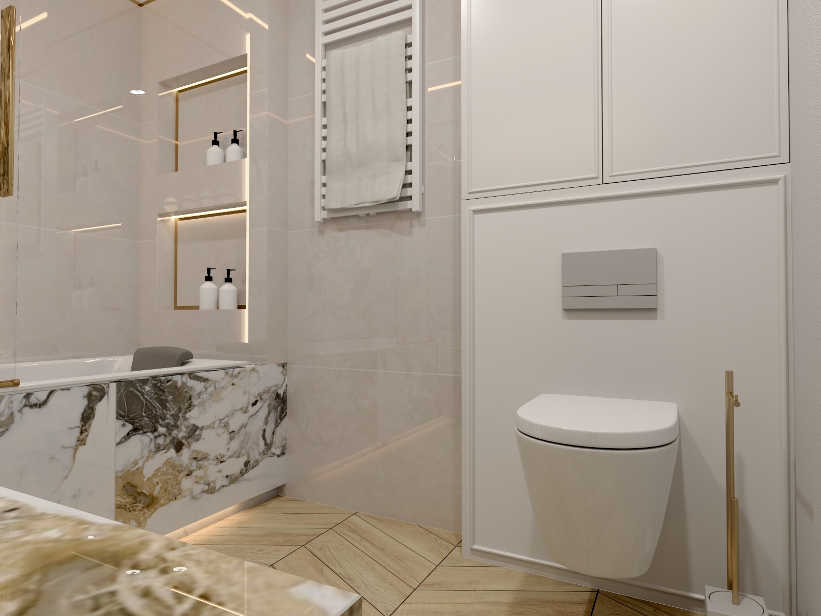złota armatura sprawi, że Twoje wnętrze będzie jedyne w swoim rodzaju. Podtynkowa armatura, okucia parawanu nawannowego, czy wieszak na papier toaletowy, są elementami, które gdy są źle dobrane mogą całkowicie położyć aranżację. Zobacz na naszą inspirację, tutaj wszystko dopięte jest na ostatni guzik, każdy, nawet najmniejszy element wykończony jest w złocie, dzięki czemu wnętrze tworzy harmonijną całość.