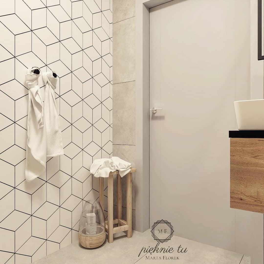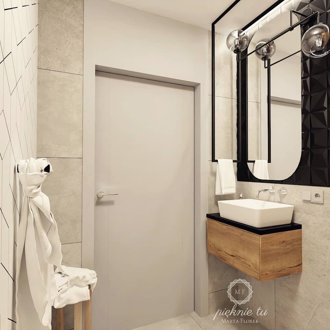 Aby wybijające się na pierwszy plan geometryczne płytki 3D nie zdominowały wystroju, na części ścian pojawia się klasyczna przeciwwaga. Stanowi ją Gres