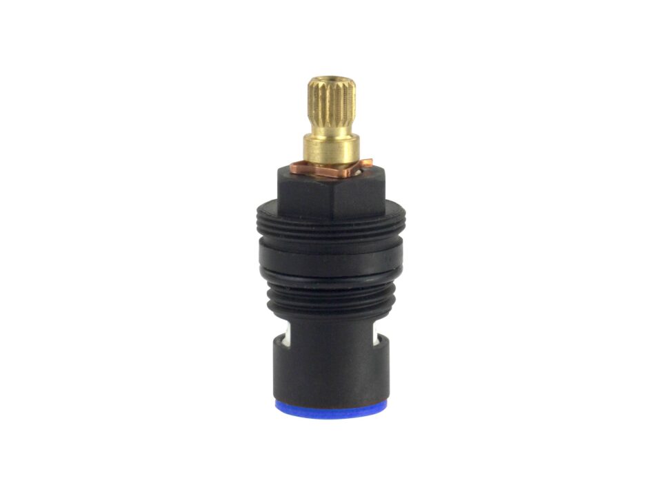 Głowica ceramiczna to trwały produkt, który zapewnia szczelność i bezawaryjność baterii. Powierzchnia jej jest gładka, dzięki czemu zapobiega osadzaniu się kamienia. Kąt obrotu głowicy wynosi 90°, co sprawia, że szybko się otwiera i zamyka. Wykonana jest z wytrzymałego tworzywa, a czpień montażowy posiada 20 klinów. Produkt przeznaczony jest do baterii dwuuchwytowej, do wody zimnej.