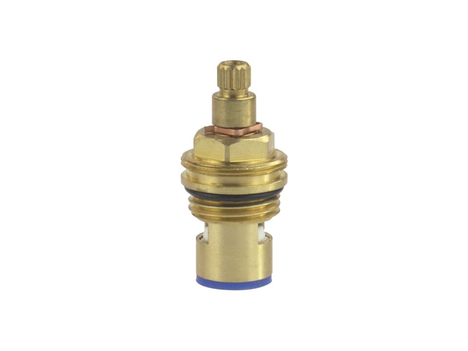 Głowica ceramiczna to trwały produkt, który zapewnia szczelność i bezawaryjność baterii. Powierzchnia jej jest gładka, dzięki czemu zapobiega osadzaniu się kamienia. Kąt obrotu głowicy wynosi 90°, co sprawia, że szybko się otwiera i zamyka. Wykonana jest z mosiądzu, a czpień montażowy posiada 15 klinów. Produkt przeznaczony jest do baterii dwuuchwytowej, do wody zimnej.