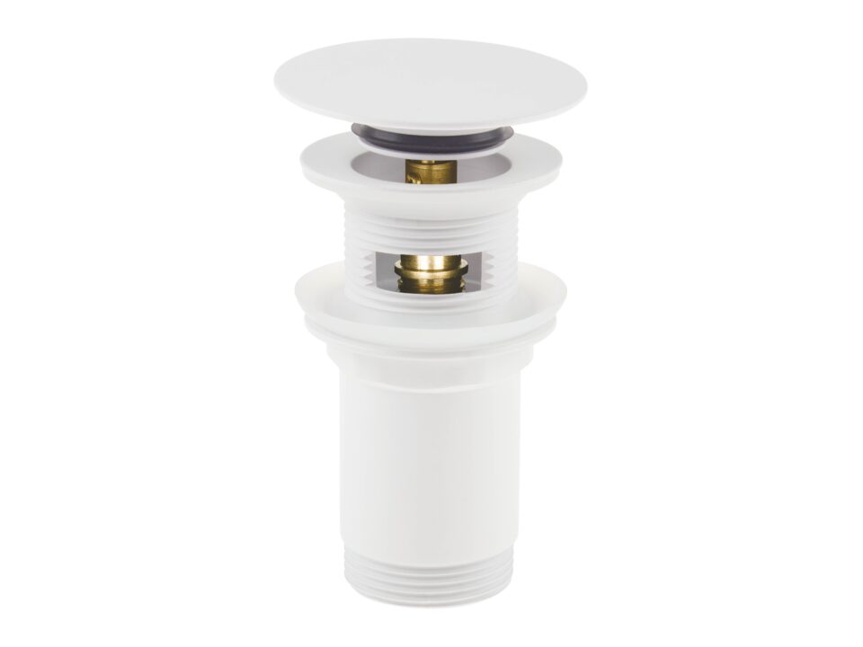 Okrągły korek do umywalki wykonany jest z wysokogatunkowego mosiądzu, co zapewnia mu trwałość i wytrzymałość na lata. Korek jest uniwersalny i pasuje do bidetu każdego rodzaju umywalek. Wygodny system click-clack pozwala na zamknięcie i otwarcie przepływu jednym przyciskiem. Białe wykończenie korka idealnie komponuje się z umywalkami ceramicznymi i granitowymi.