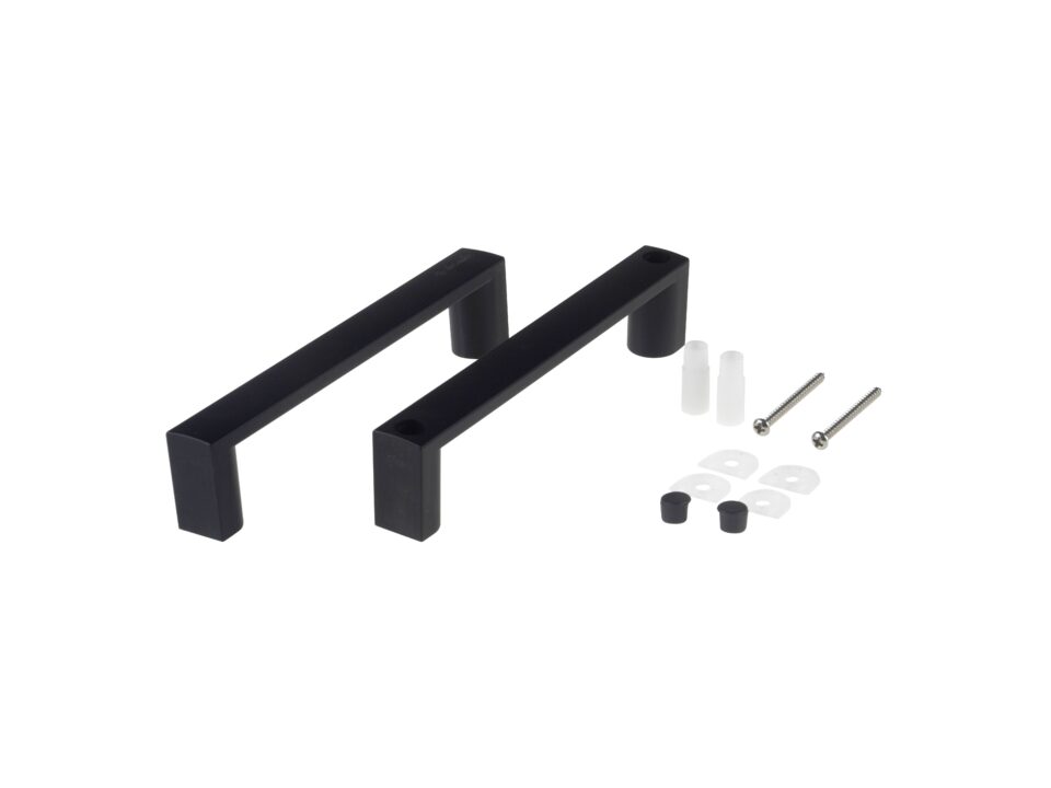 Wymienny komplet uchwytów do drzwi kabiny. Uchwyty mają otwory montażowe FI 4mm, a ich rozstaw to 140 mm. Wykończone są w matowym, czarnym kolorze.