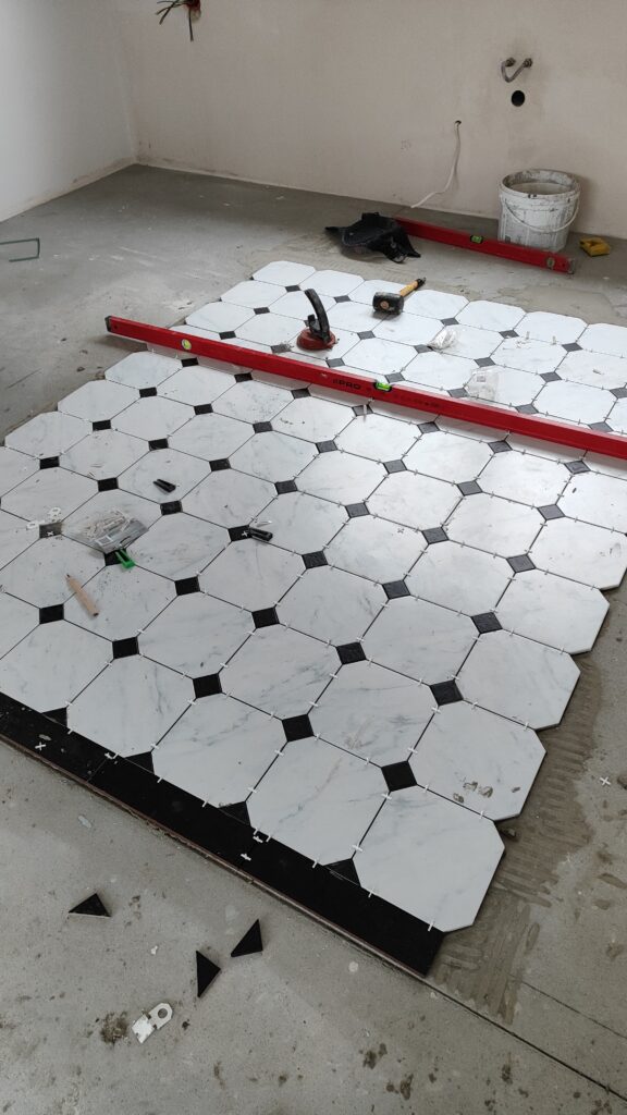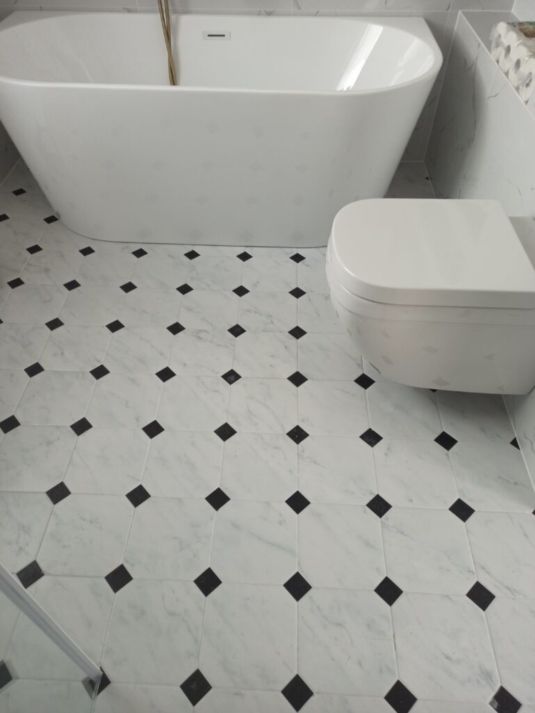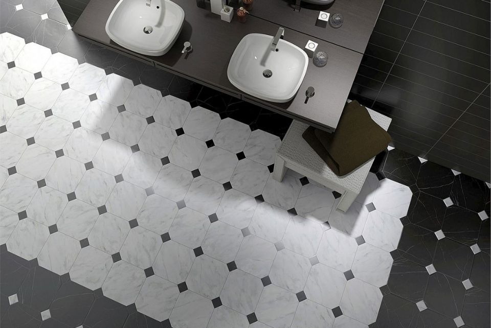 piękny gres oktagonalny imitujący biały matowy marmur
