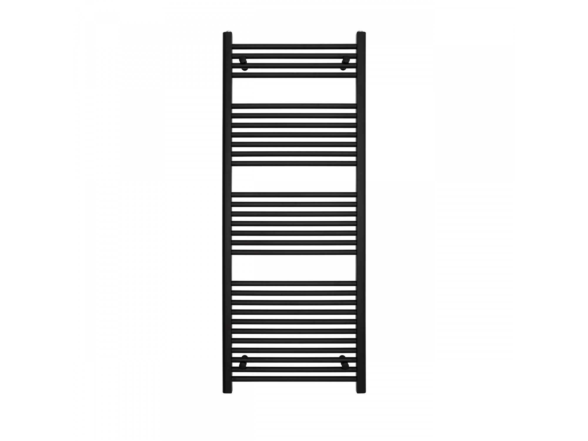 Prosty grzejnik łazienkowy drabinkowy zbudowany z dwóch kolektorów o przekroju “U” połączonych poziomo ułożonymi rurkami. Klasyczna i niezmiennie od lat popularna forma. Szersze przerwy między rurkami ułatwiają przewieszanie ręczników. Grzejnik w kolorze czarnym.