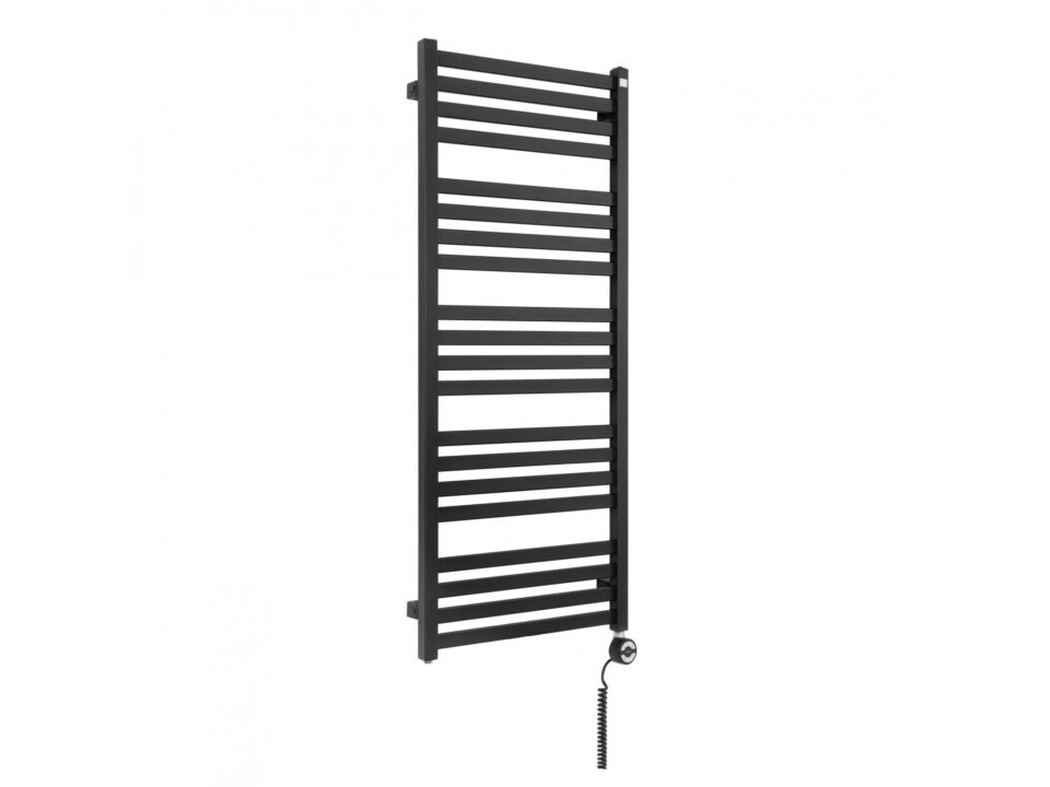 Produkt o wymiarach 1210x500mm z grzałką elektryczną Terma Moa o mocy 600W zamontowaną z prawej strony grzejnika. Kabel spiralny z wtyczką.