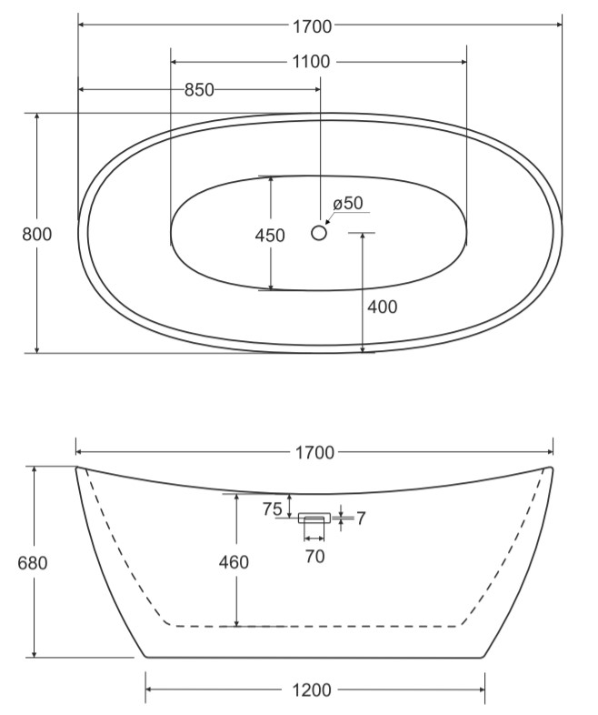 wanna wolnostojąca BESCO AYLA 170x80- RYSUNEK TECHNICZNY: