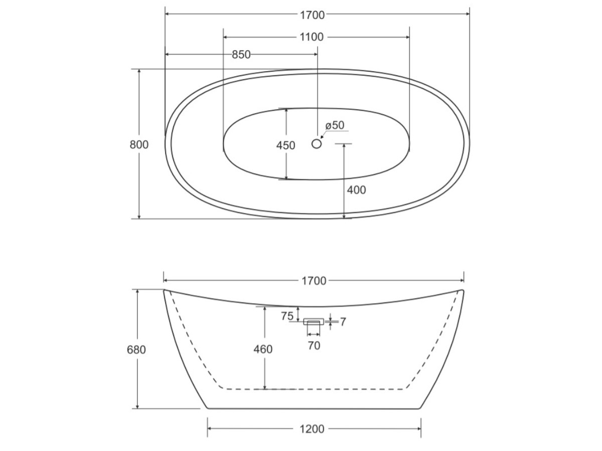 wanna wolnostojąca BESCO AYLA 170x80- RYSUNEK TECHNICZNY: